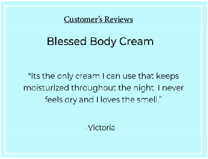 Blessed Body Cream is the ultimate moisturizer! It is not only great for the body but also for the hair. Like everything else we sale this is made by hand and carefully formulated to include only the best ingredients to nurture your skin! Blessed Body Cream is the ultimate moisturizer! It is not only great for the body but also for the hair. Like everything else we sale this is made by hand and carefully formulated to include only the best ingredients to nurture your skin!